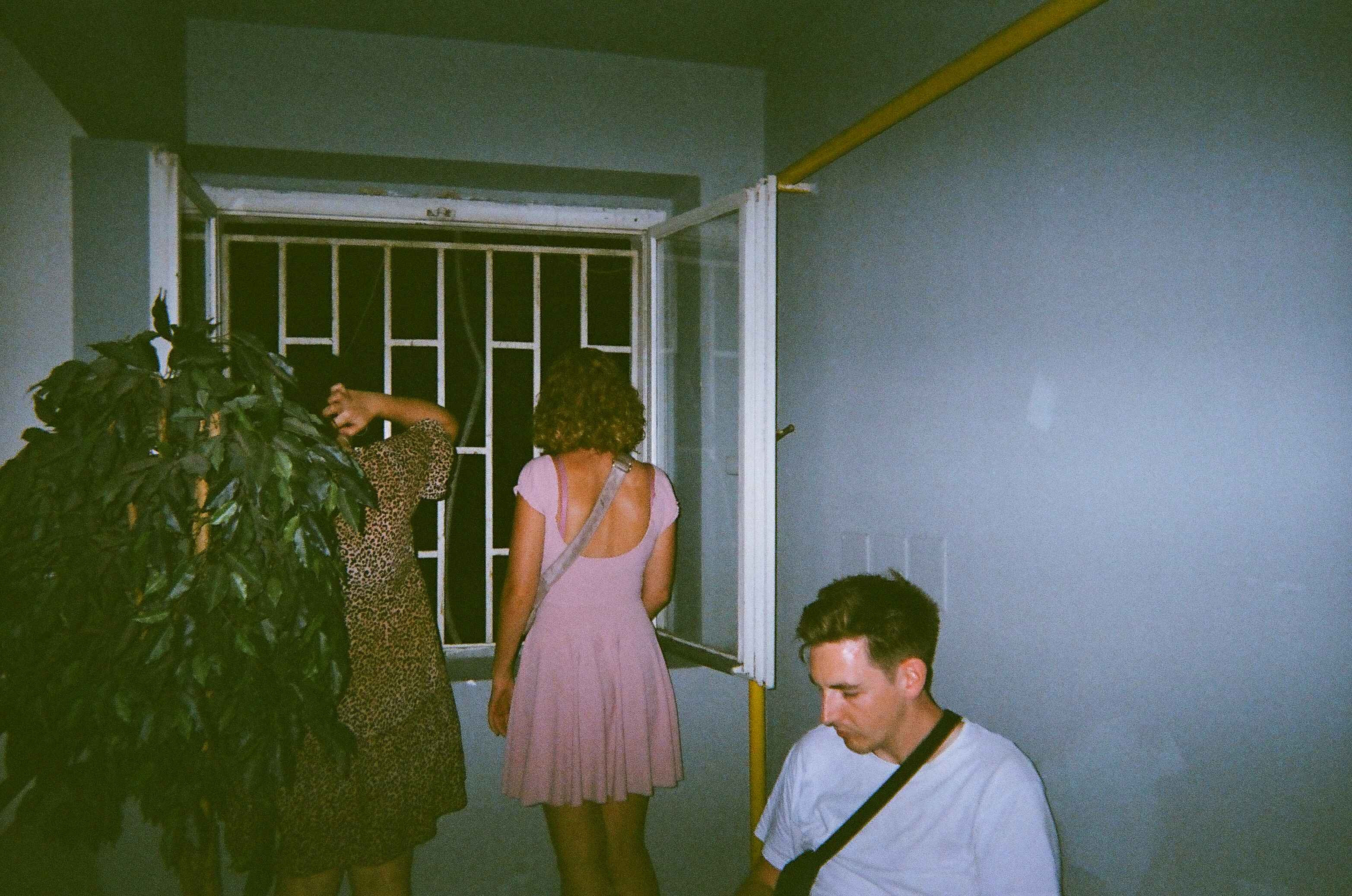 Max, Rhi and Beth looking out the windows during a thunderstorm in Prague